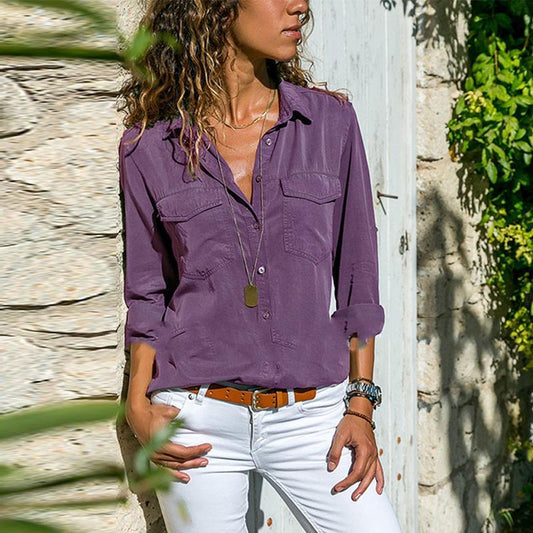 Casual Solid Color Long Sleeve Plain Button Pocket Blouses Tops