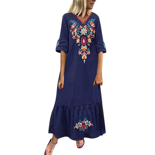 Women Casual Boho Floral Embroidery V-Neck Ruffled Linen Maxi Kaftan Midi Dresses