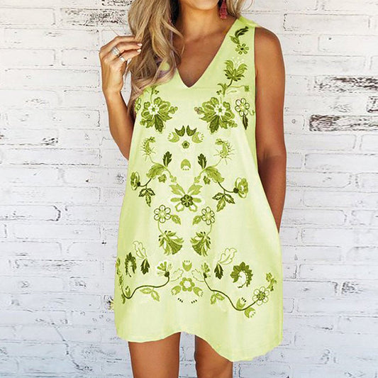 Floral Print Women Fashion V-neck Sleeveless Casual Loose Summer Loose A-line Party Dress
