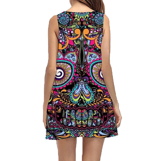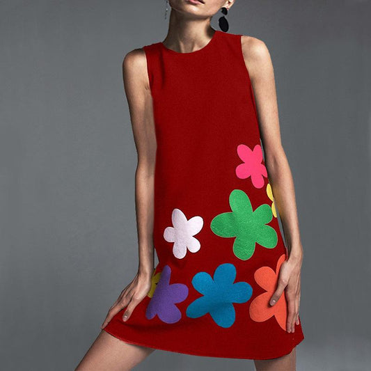 Summer new women's ladies round neck sleeveless high waist A word skirt print fashion wild dress