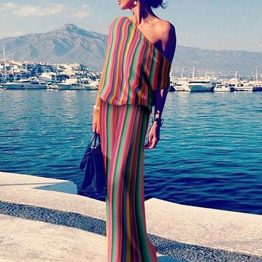 Summer new hot multi-color striped one-shoulder dress