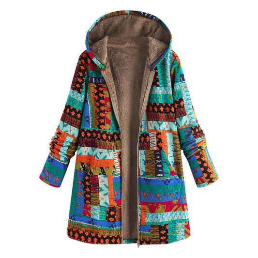 Women Parkas Winter Warm Outwear Floral Printing Hooded Pockets Oversize Hasp Inlaid Cotton Coats