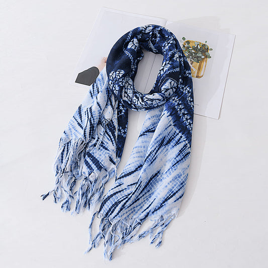 Retro ethnic scarf women's spring and autumn imitation blue dyed wild literary long summer sun protection holiday shawl scarf