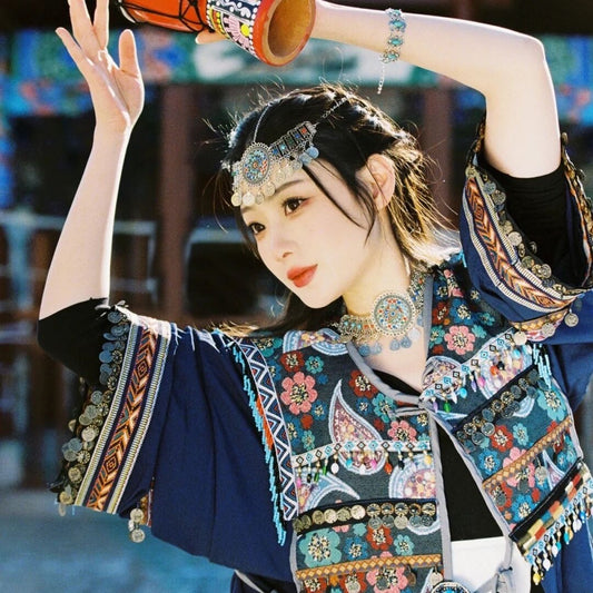 Forehead Ornament Tibetan Costume Antique Minority Exotic Headdress Forehead Ornament Hearwear Hair Ornament Bracelet and Earrings