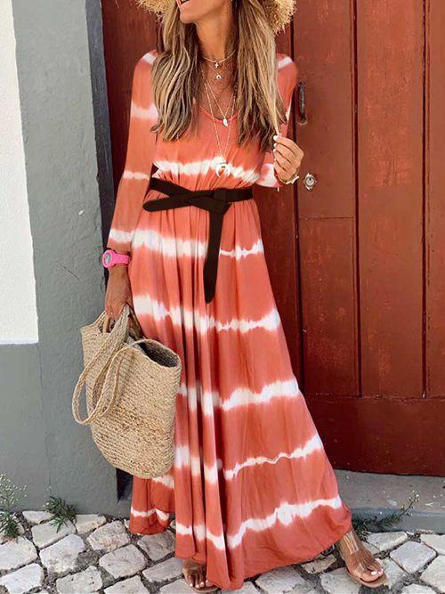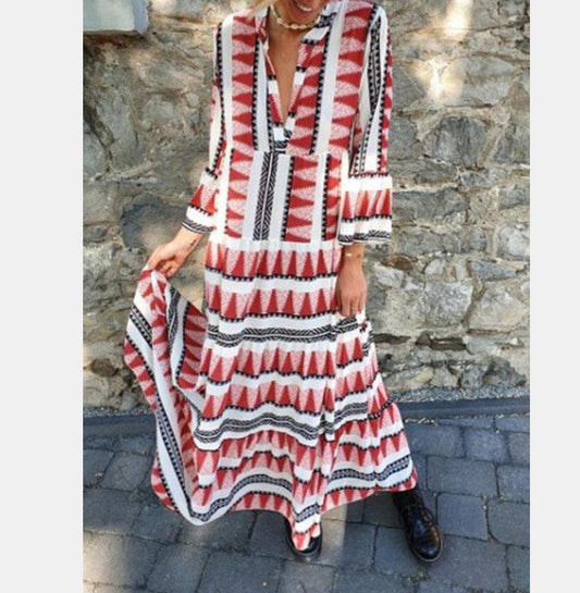 Loose Casual Skirt Solid Color V-collar Printed Long-sleeved Dress