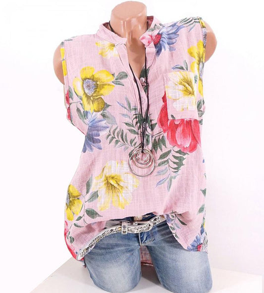 Standing Collar Slub Hemp Printed Sleeveless T-shirt