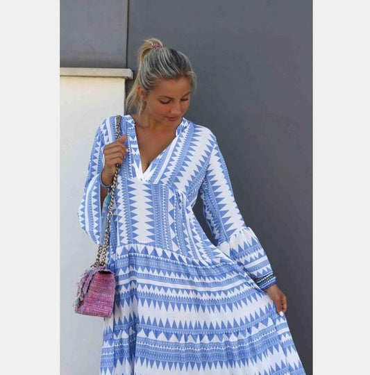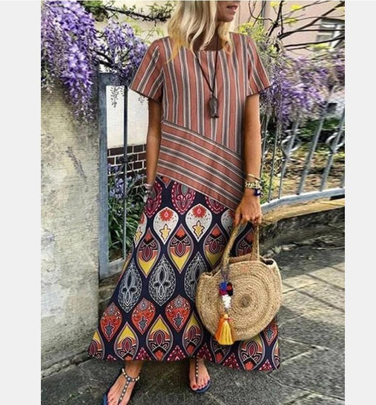 Printed Long Dress Short Sleeved Striped Women's Dress