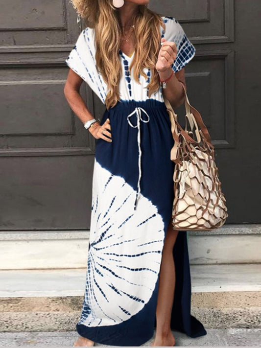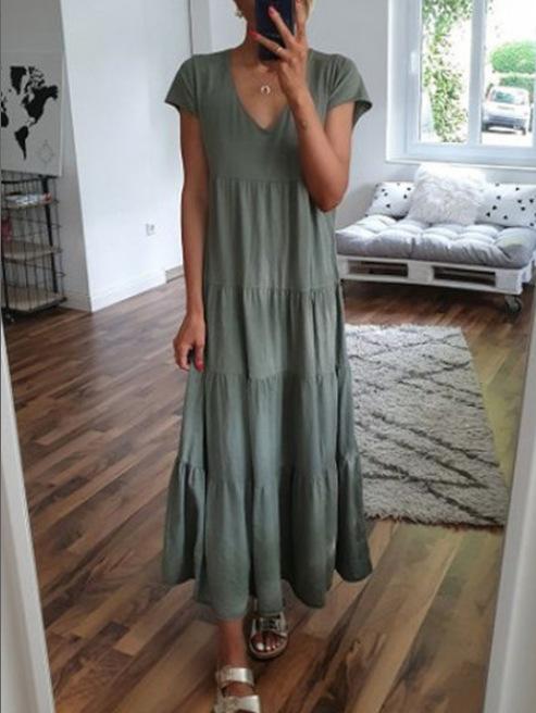 V-neck-fold Short Sleeve Multi-layer Casual Long-dress Dress