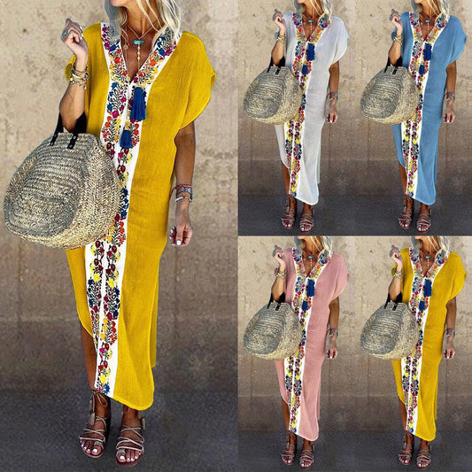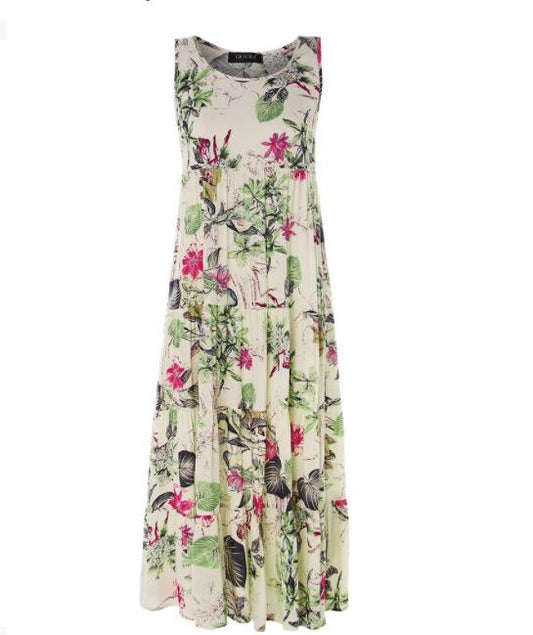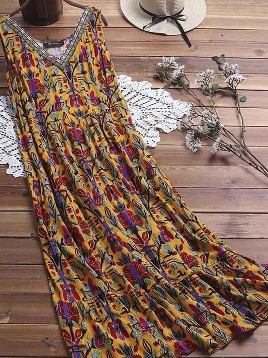 Vintage Floral Print Sleeveless Crew Neck Long Dress