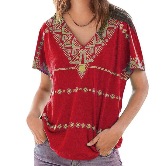 Loose V-neck Short Sleeve Positioning Stitching Casual Printed T-shirt