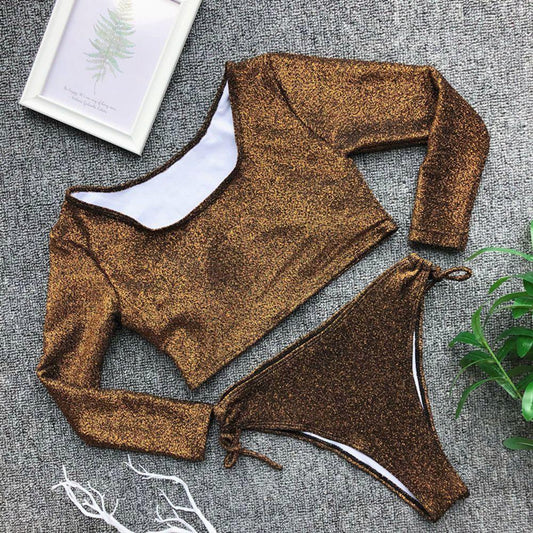 Gold Bikini Long Sleeve Swimsuit Bling Swimwear Glitter Fabric Shiny Sexy Women High Waist Cut Strap Bikinis