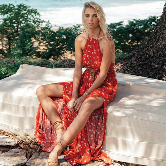 Bohemian Dress Print Chiffon Sling Sexy Backless Split Holiday Dress