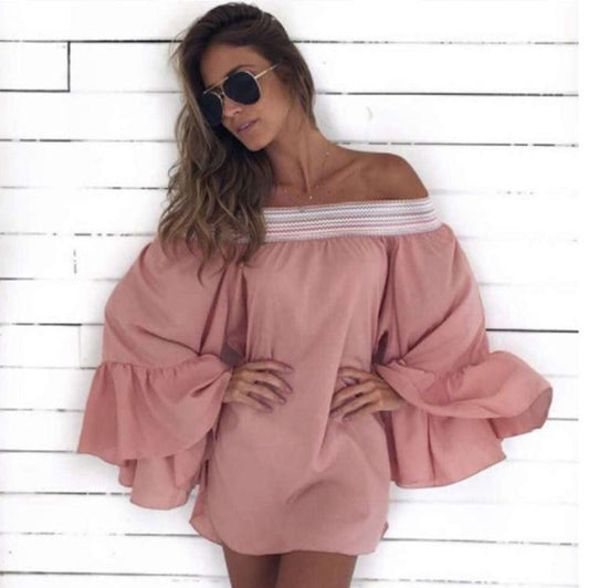 Loose Solid Color Shoulder Long Sleeve Pleated Dress