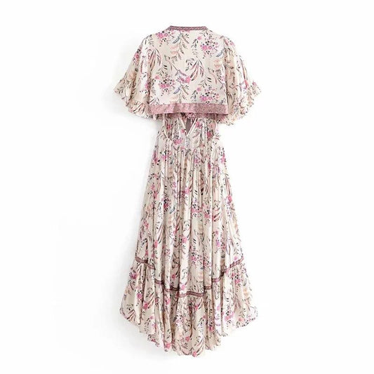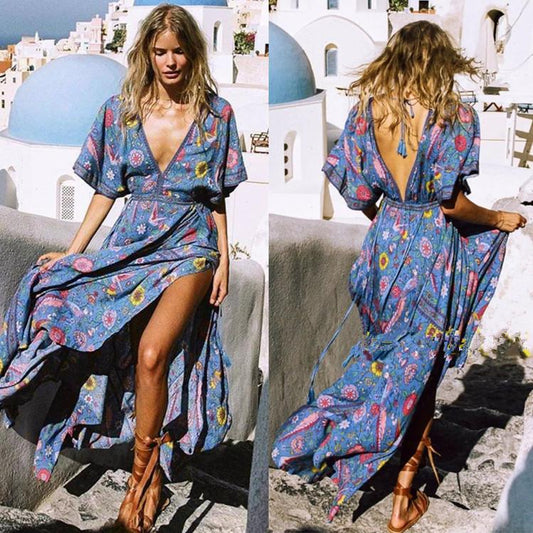 Boho Vintage Deep V-neck Irregular Backless Print Dress