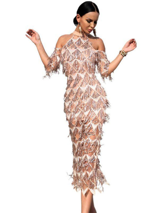 Beaded Tassel Stitching Off-the-shoulder High-end Party Midi Dress