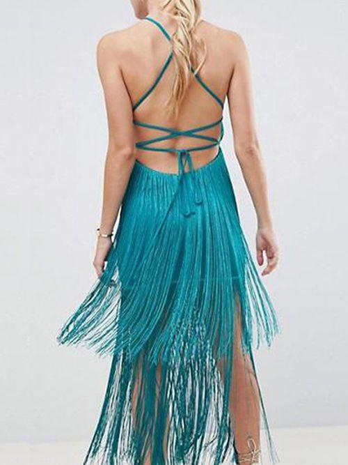 Solid Color Tassel Sling Zip Open Back Stitching Midi Dress