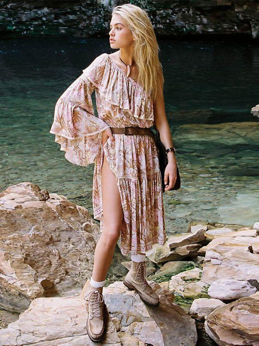 One-shoulder Sleeve Ruffled Lace Stitching Bohemian Dress