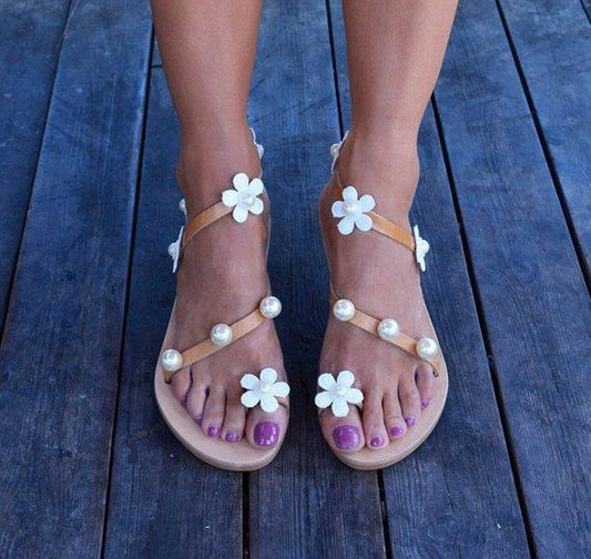 Flat Bottomed Flower and Pearl Adornment Toed Casual Sandals