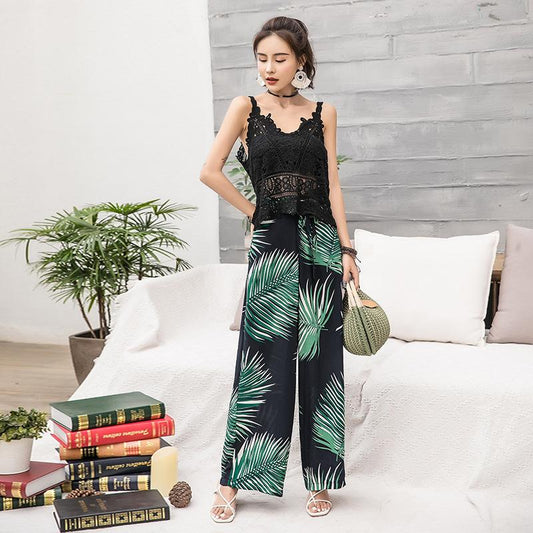 Bohemian Wide-leg Pants High Waist with Floral Pants Seaside Holiday Beach Trousers