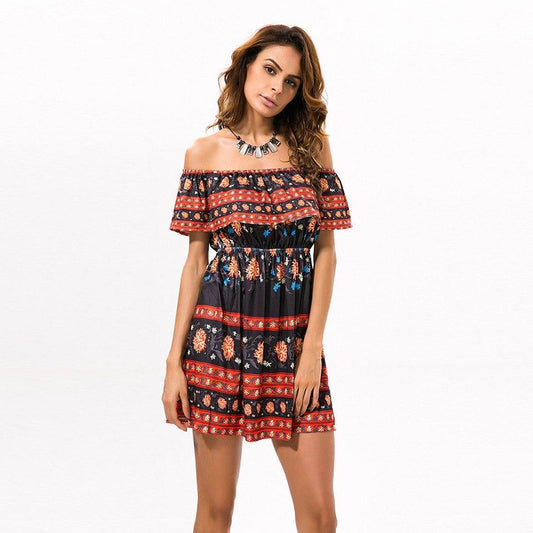 Off shoulder Tribal Floral Summer High Waist Beach Sexy Mini Dress