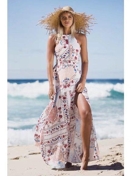 Seaside Vacation Retro Beach Big Swing Halterneck Split Dress