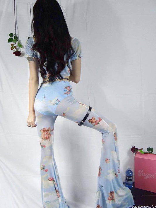 Off-The-Shoulder Print Elastic Long-Sleeved Top