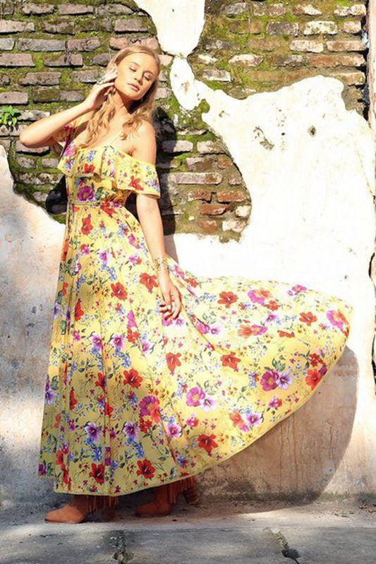 Boho Floral Print Off Shoulder Spaghetti Strap Beach Midi Dress