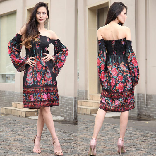 Boho Red Floral Print Flare Sleeve Mini Dress