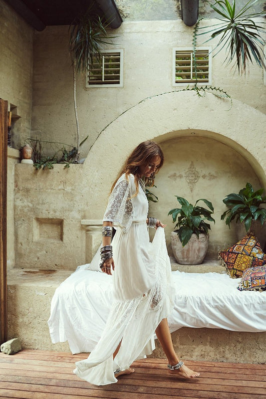 Spring And Summer Bohemian V-Neck High Waist Lace Stitching Big Swing Skirt