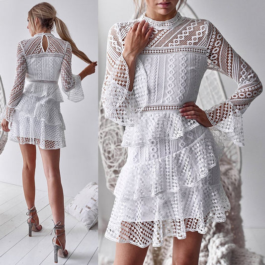Autumn Sexy Long Sleeve Falbala Sleeves Lace Hollow Dress