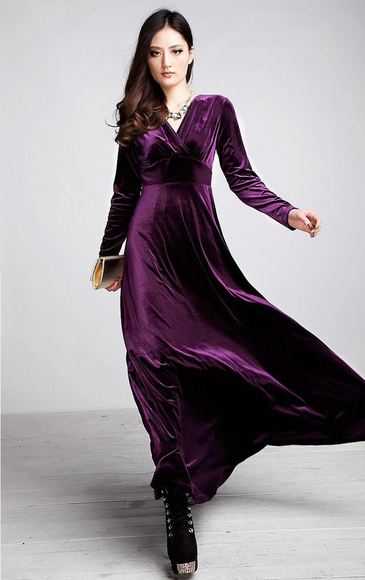 Velvet V Neck Long Sleeve High Waist Maxi Dress