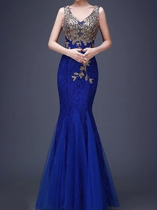 V-Neck Applique Mermaid Evening Dress