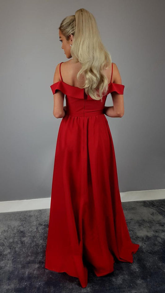 Red Off Shoulder Split Evening Party Maxi Dress