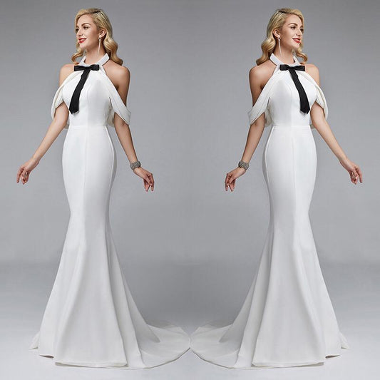 White Contrast Bow Backless Sexy Evening Maxi Dress