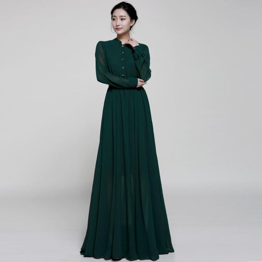 Stand-Up Collar Single-Breasted Long-Sleeved Large Swing Chiffon Mopping Dress