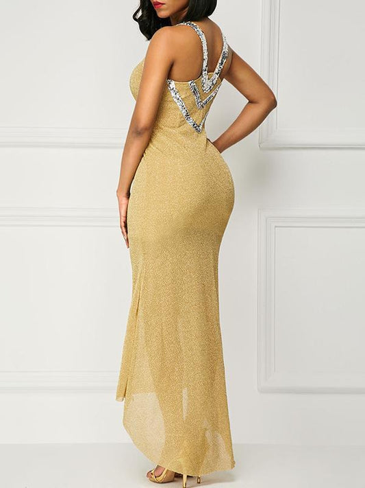 Spaghetti Strap Sequin Splice Evening Maxi Dress
