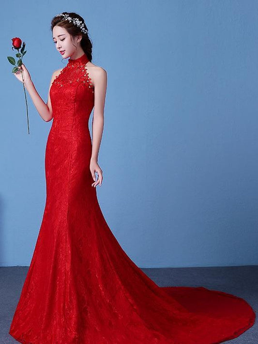 Fashion Lace Hanging Neck Slim Sleeveless Wrapped Chest Swallowtail Evening Dress