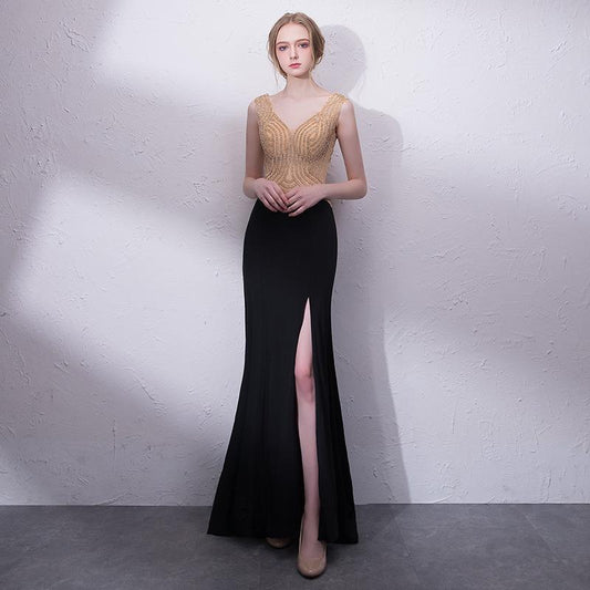 Black V-Neck Lady Elegant Tailing Banquet Dress