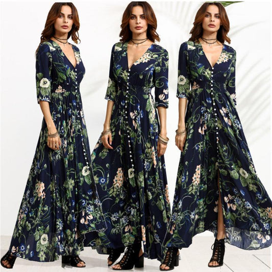 Women Single-Breasted Mid Sleeves Printed Maxi Dress