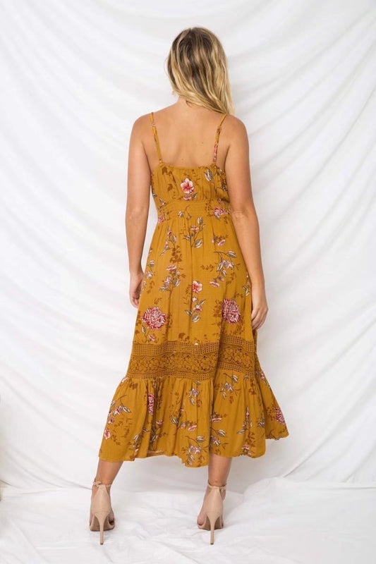 Floral Print V Neck Spaghetti Strap Bohemia Beach Maxi Dress