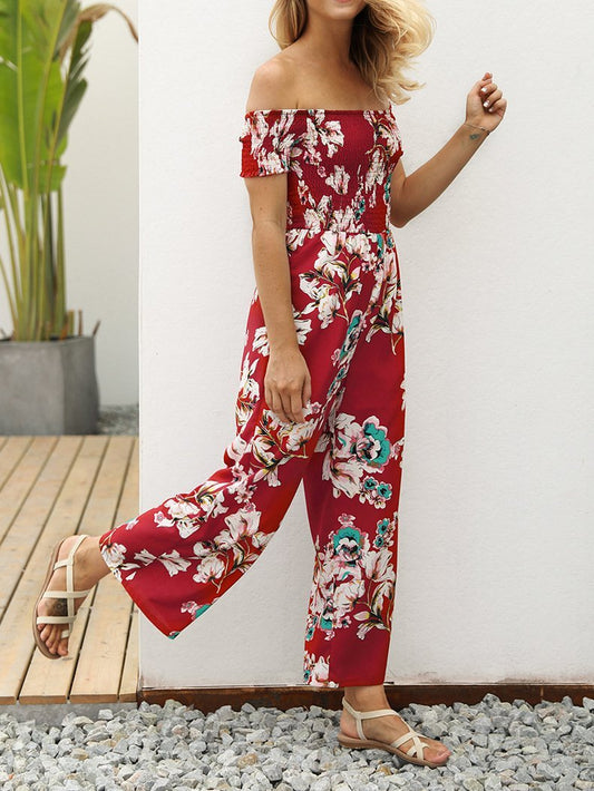 Off Shoulder Printed High Waist Wide Leg Pants Jumpsuit Romper