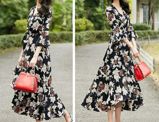 2018 New Chiffon Printed Irregular Maxi Dress