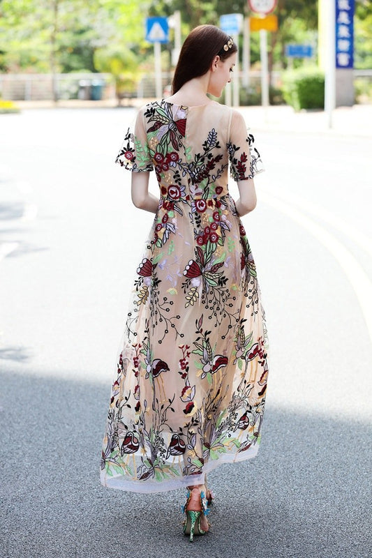Elegant Embroidered Round Neck Short Sleeve Maxi Dress