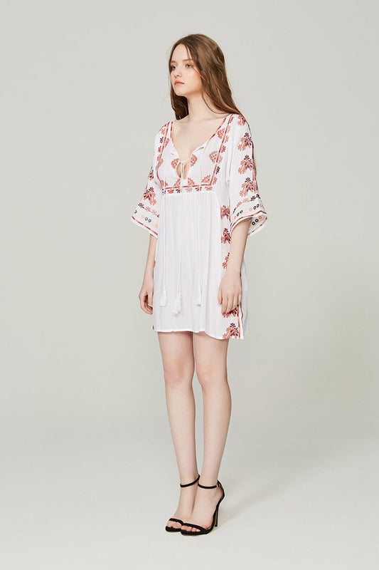 Elegant V Neck Long Sleeve Embroidered Bohemia Maxi Long Dress