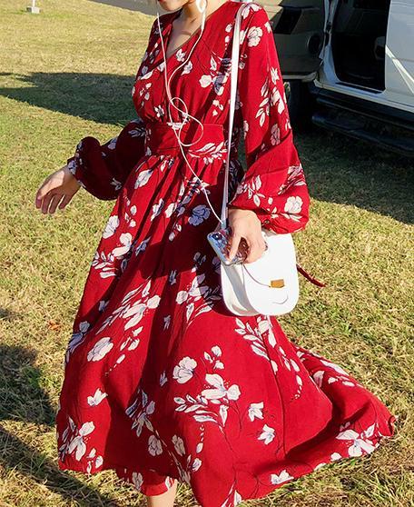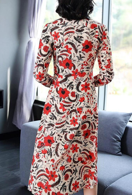 2018 New Chiffon Floral Print V Neck Long Sleeve Beach Bohemia Dress