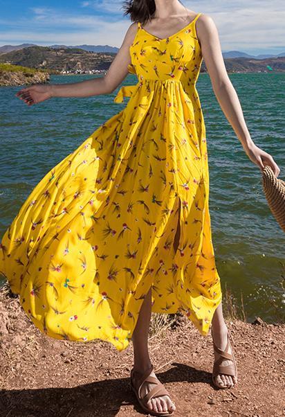 2018 New Floral Print Spaghetti Strap Split Chiffon Beach Maxi Dress