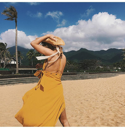Sexy Spaghetti Strap V Neck Backless Solid Color Beach Dress