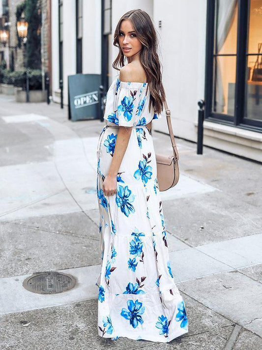 2018 New Floral Print Off Shoulder Short Sleeve Side Split Maxi Long Dress