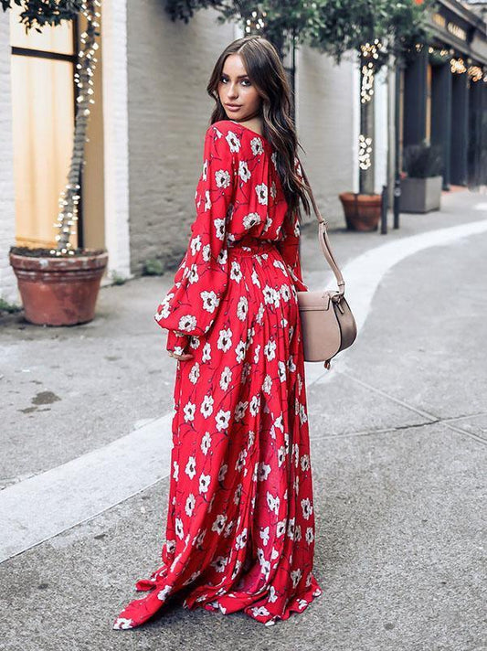 Elegant Printed V Neck Batwing Sleeve High Waist Maxi Long Dress