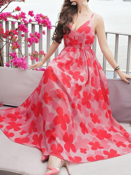 Sexy Chiffon Spaghetti Strap Floral Print Beach Maxi Long Dress
